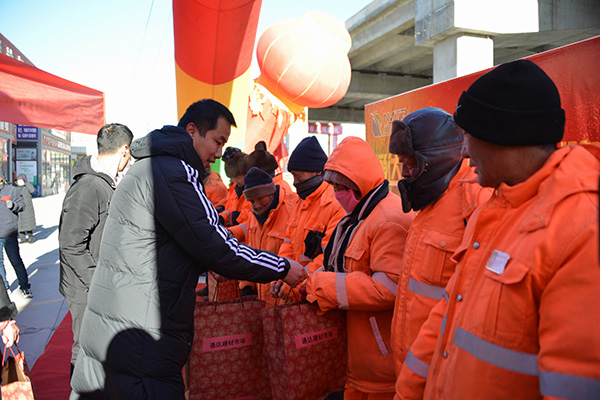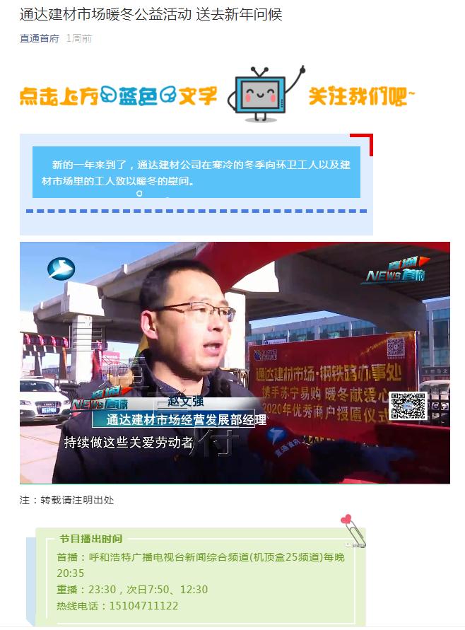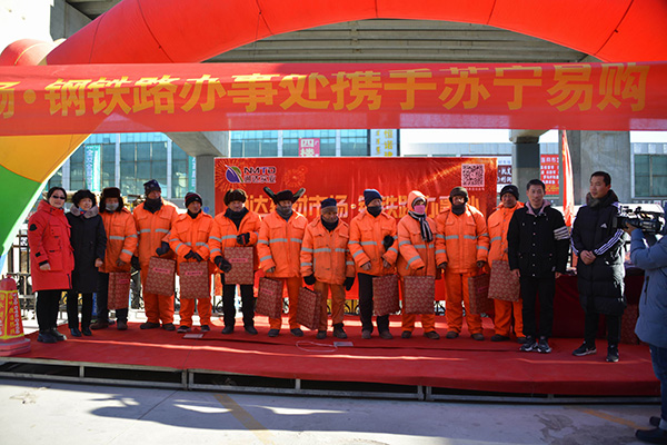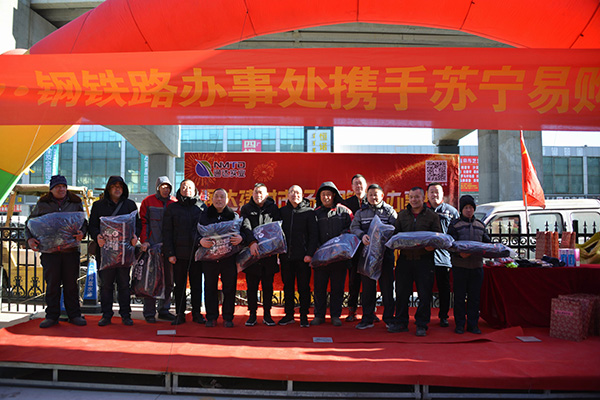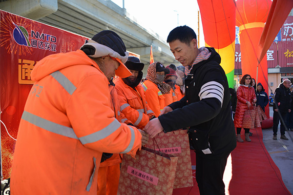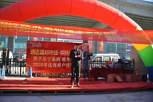2020年11月29日舉行了通達建材市場2020年暖冬活動以及優(yōu)秀商戶授匾儀式。整體活動分為三部分,1.由市場主導定制沖鋒衣,蘇寧易購出資,共同為市場以及周邊裝卸工提供暖冬定制沖鋒衣。2.聯(lián)合鋼鐵路辦事處,召集周邊環(huán)衛(wèi)工人,發(fā)放采購好的保暖 慰問品和定制水杯。3.公布優(yōu)秀商戶名單,并進行授匾儀式。王總在活動當中講到“我們要共同努力克服每一個困難,只要路的對的,就不怕路遠”樹立了商戶對未來的信心。整體過程由首府直通車全程參與,活動期間鋼鐵路辦事處領導的講 話也是非常認可我們建材市場的工作。