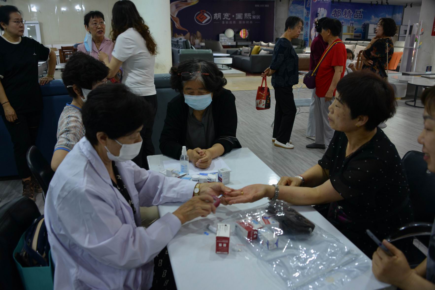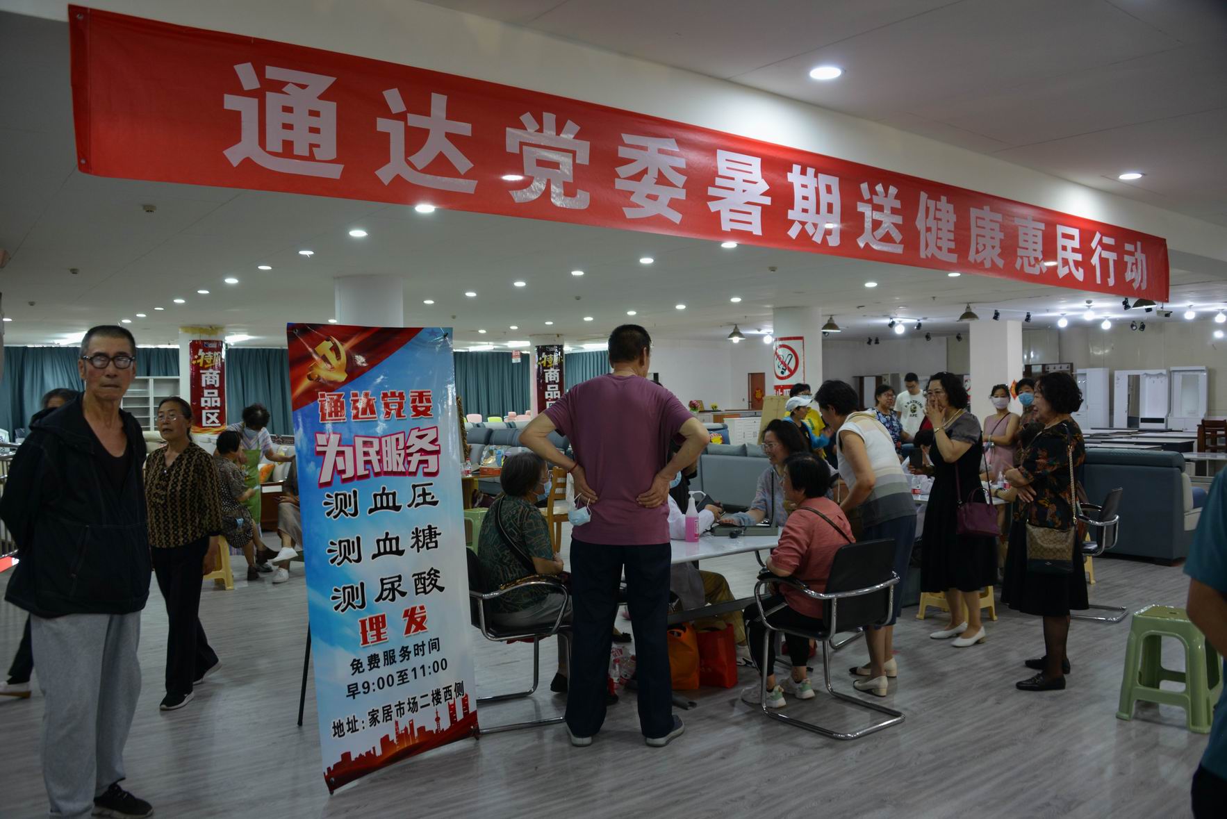 7月18日上午通達公司黨委組織善愛之舟關(guān)愛長者志愿會開展了一場以“通達黨委暑期送健康惠民行動”為主題的志愿服務(wù)活動。在南站家具市場,志愿者們早早將活動場地布置妥當,為周邊的老百姓提供測血壓、測血糖、測尿酸、理發(fā)等公益性志愿服務(wù)。志愿者們用她們的熱心與愛心,如一縷清風(fēng)般為本以炎熱的天氣帶來了一絲清涼。