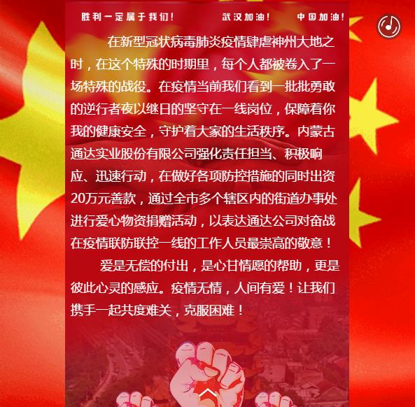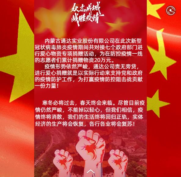 內(nèi)蒙古通達(dá)實(shí)業(yè)股份有限公司在此次新型冠狀病毒肺炎疫情期間共對(duì)接7個(gè)政府部門進(jìn)行愛心物資專項(xiàng)捐贈(zèng)活動(dòng),為在防控疫情一線的志愿者們累計(jì)捐贈(zèng)20萬元。