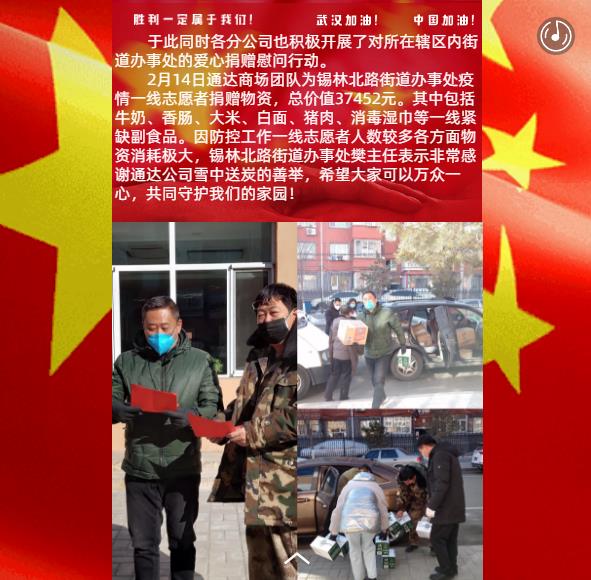 在新型冠狀病毒肺炎疫情肆虐神州大地之時(shí),在這個(gè)特殊的時(shí)期里,每個(gè)人都卷入了一場(chǎng)特殊的戰(zhàn)役。在疫情當(dāng)前我們看到一批批勇敢的逆行者夜以繼日的堅(jiān)守在一線崗位,保障著你我健康安全,守護(hù)者大家的生活秩序。內(nèi)蒙古通達(dá)實(shí)業(yè)股份有限公司強(qiáng)化責(zé)任擔(dān)當(dāng)、積極響應(yīng)、迅速行動(dòng),在做好各項(xiàng)防控措施的同時(shí)出資20萬元善款,通過全市多個(gè)轄區(qū)內(nèi)的街道辦事處進(jìn)行愛心物資捐贈(zèng)活動(dòng),以表達(dá)通達(dá)公司對(duì)奮戰(zhàn)在疫情聯(lián)防聯(lián)控一線的工作人員最崇高的敬意!