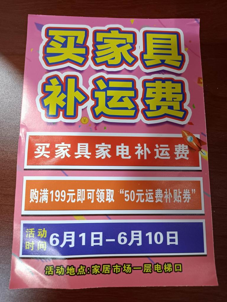 南站家居市場(chǎng)端午節(jié)促銷活動(dòng),從6日1日至10日,本著回饋消費(fèi)者,提升商戶銷售量,烘托購(gòu)物氣氛,買家具補(bǔ)運(yùn)費(fèi),來(lái)吸引消費(fèi)者,家具市場(chǎng)從6月11日開始至13日,進(jìn)行補(bǔ)運(yùn)費(fèi)領(lǐng)現(xiàn)金活動(dòng),商戶,消費(fèi)者對(duì)本次促銷形式滿意,本次活動(dòng)即增加了商戶銷售額,又提升了市場(chǎng)知名度。